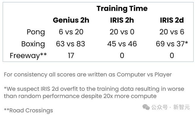 他们将Genius 10k/2h的性能与IRIS进行了对比,后者使用相同的1万步数据,但训练时间为2天(记为10k/2d)。