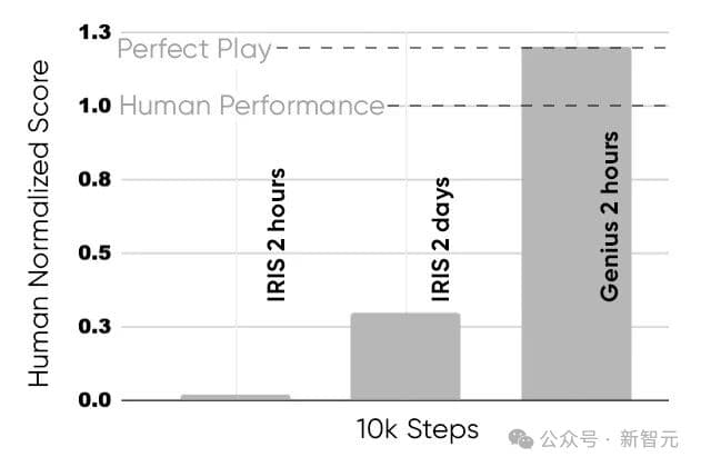 研究者在2小时内,用1万步游戏数据分别训练了Geniu和IRIS(记为10k/2h)。