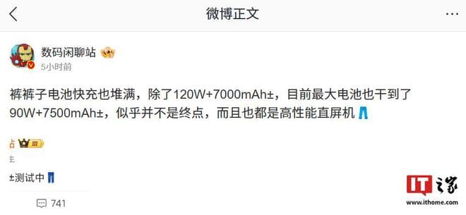 IT之家 1 月 21 日消息,博主@数码闲聊站 今日发文透露,iQOO 除了采用 120W + 7000mAh± 电池方案的新机外,目前最大电池干到了 90W +7500mAh±,都是高性能直屏机。另外博主还表示“似乎并不是终点”。