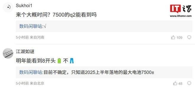博主还回复了部分网友的问题:针对 7500mAh 电池新机落地时间是否为 Q2,博主回复“√”;针对 iQOO 明年能否会推出 8000mAh 电池新机,博主称“目前不确定,只知道 2025 上半年落地的最大电池 7500±”。