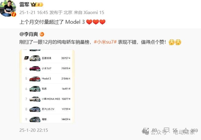 电动知家消息,1月21日,小米集团董事长兼 CEO 雷军转发小米汽车副总裁李肖爽的微博,并称小米 SU7 上个月(2024 年 12 月)交付量超过特斯拉 Model 3(参数丨图片)。