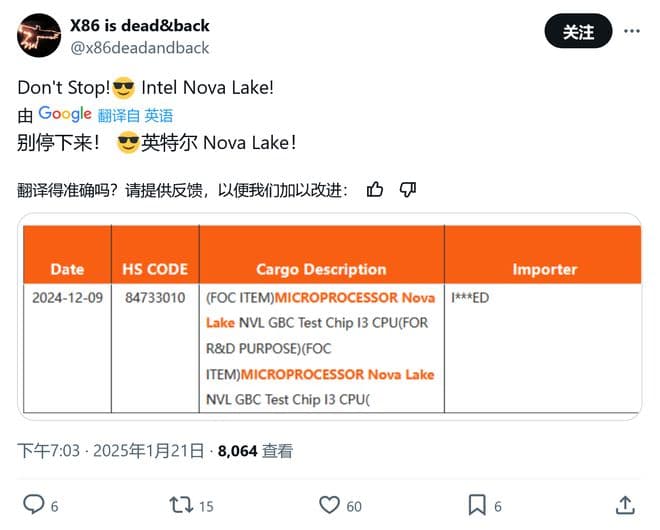 IT之家 1 月 22 日消息,消息源 @x86deadandback 昨日(1 月 21 日)在 X 平台发布推文,在运输清单中发现了英特尔下一代 Nova Lake CPU 的踪迹,预示着其开发进展顺利。