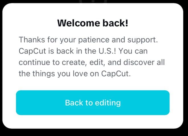 “欢迎回来!感谢您的耐心与支持。CapCut 重新在美上线!您可以继续在 CapCut 上创作、编辑,并探索您喜爱的内容。”