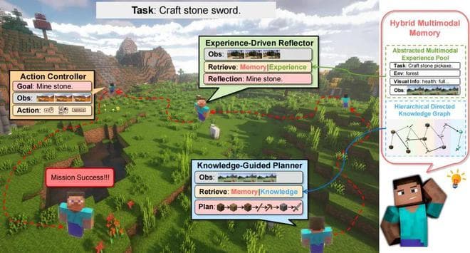 在近期一项研究中,课题组提出一种混合多模态记忆模块,该模块包含结构化知识(HDKG,Hierarchical Directed Knowledge Graph)和多模态经验(AMEP,Abstracted Multimodal Experience Pool),能够为智能体在规划和反思过程中提供必要的知识和经验。