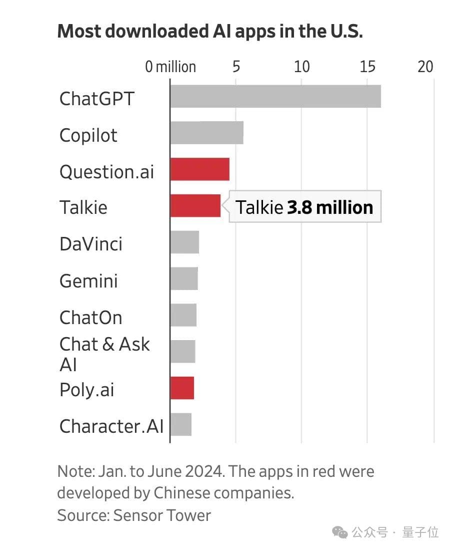 据Sensor Tower监测2024上半年数据,其旗下出海产品Question.AI杀入美国AI类应用下载量前三,并拿下百万MAU。另一款对话型AI产品Poly.AI同样进入下载的前三十名。