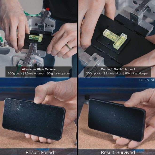 在康宁实验室测试中,Gorilla® Armor 2 在模拟混凝土的表面上从 2.2 米的高度跌落后仍能完好无损。其他玻璃陶瓷材料从一米的高度跌落就失效了。
