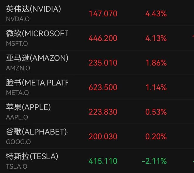 大型科技股多数上涨。个股方面,英伟达、微软涨超4%,特斯拉跌逾2%。