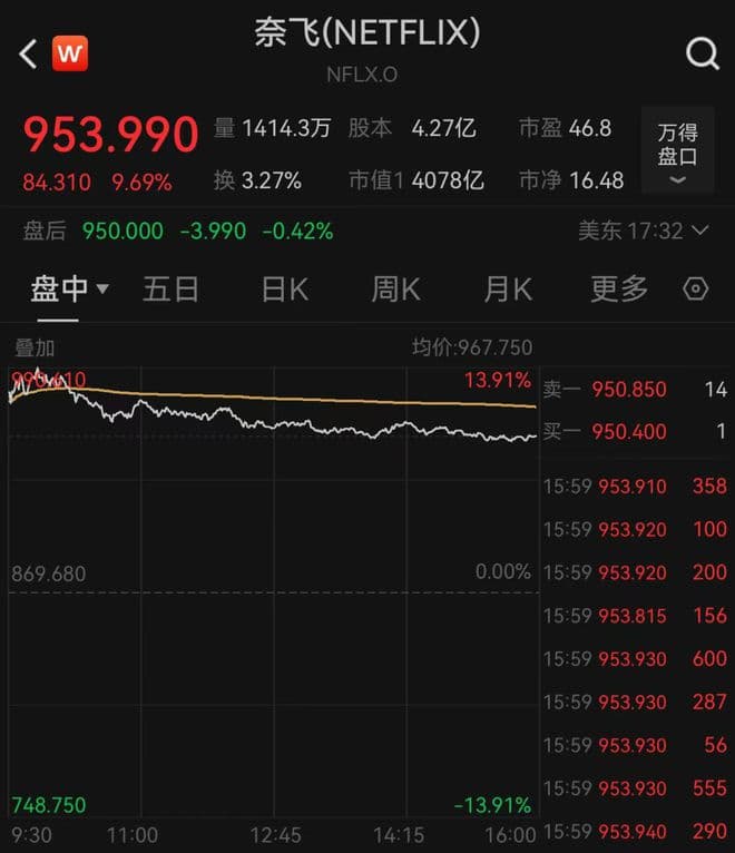 此外,奈飞(Netflix)公司股价大涨,一度涨超13%,逼近1000美元关口,飙升至历史新高。截至收盘,涨幅收窄至9.69%,报953.99美元/股。