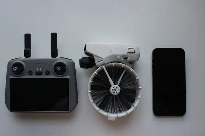 并且,它的整体的体积也非常亲民,高度大概相当于一台iPhone,而桨叶折叠后的宽度大概来到了6cm左右,整体上还是非常小巧——如果你的口袋够大,装在外衣里应该也不是什么问题。