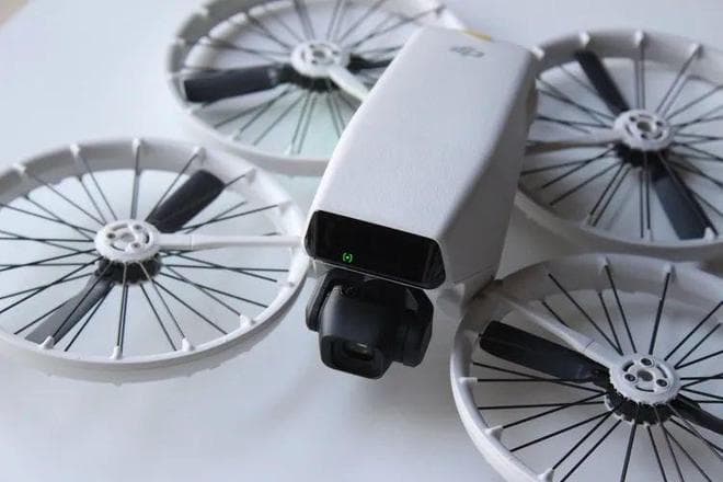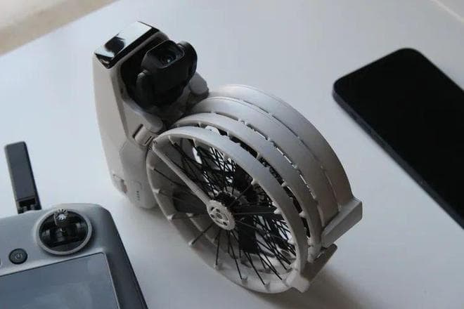 过去,Mavic系列也拥有折叠的设计,不过是将螺旋桨收纳于机身两侧,而DJI Flip则是创新性地向底部弯折,折叠后酷似“轮椅”。如果你将DJI Flip收纳一次就立刻感受到这样设计的好处——过去的弯折还需要考虑桨叶的方向和位置,避免弯折。有了向下的弯折设计,加上全包围桨叶保护罩可以非常放心的直接塞到你的书包里。