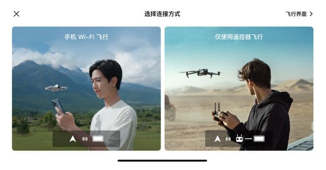 第一次连接DJI Flip时,仍然可以选择连接智能手机,或是你的DJI RC 2遥控器。