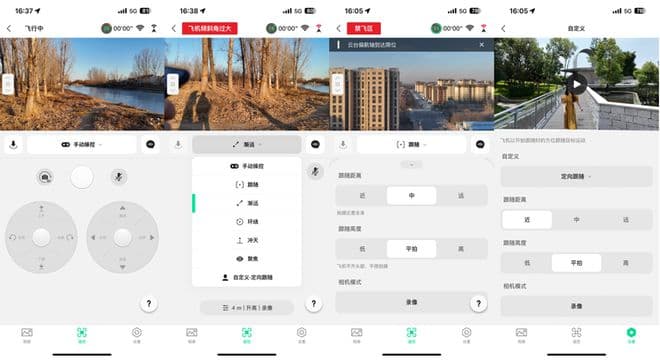 这里也不得不提一下,机身上的模式按键,提前预设了智能拍摄模式,比如跟随模式,打开就可以对着用户直接开拍,另外四个:渐远、环绕、冲天、聚焦 ,其实是大疆无人机的几个景点动作了,可以实现“一键短片”即分享的效果。