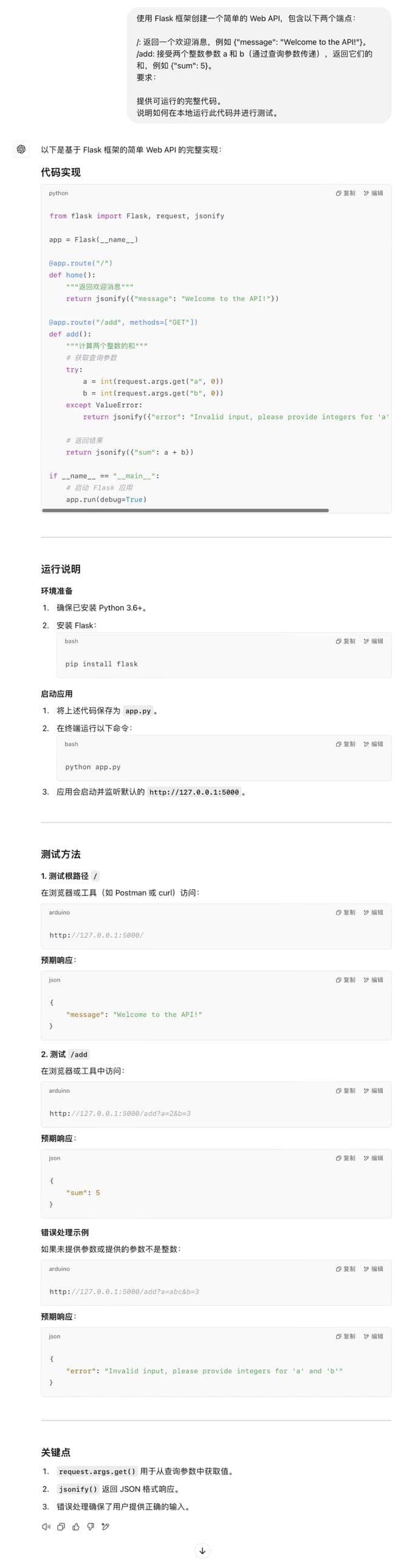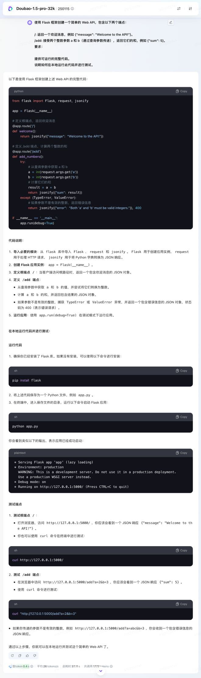 显而易见,豆包关于代码问题的输出格式设置,会更贴近原生的编码界面。相较于 GPT-4o ,能够进行必要且详细的代码说明,并且在这一部分对参数类型问题就给出了预设和解答,即如果参数并不有效,状态代码就为400,然后才给出了运行代码并进行测试的方法。总体而言,Doubao-1.5-pro 相较于 GPT-4o 输出的代码会更加精细一点。
