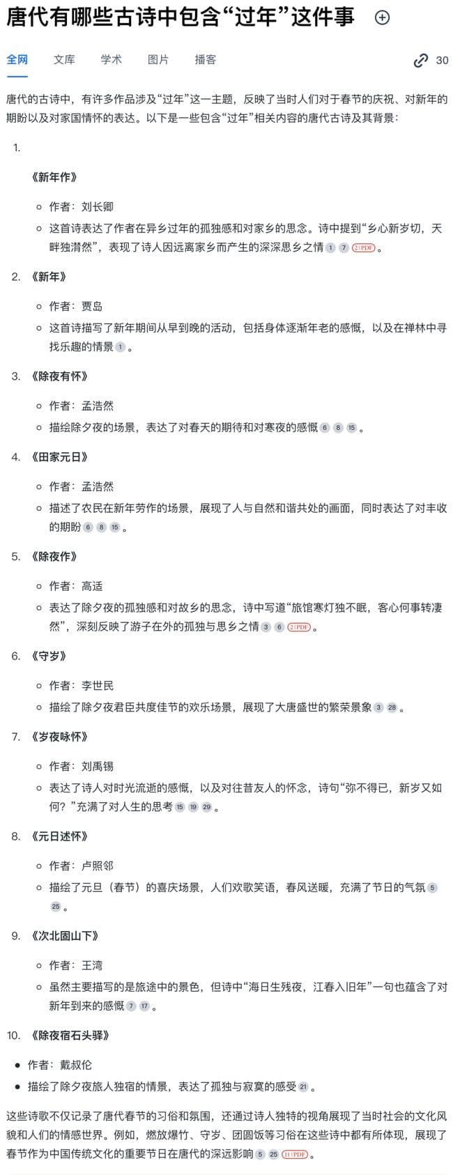 针对“知识能力”一项,将 Doubao-1.5-pro 和同为主打中文语境的一个国产模型进行对比,提出的问题是:唐代有哪些古诗中包含“过年”这件事?国内某大模型产品给出的答案是: