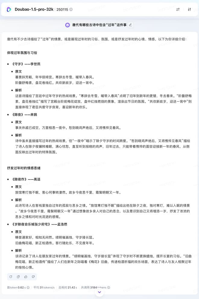 Doubao-1.5-pro 则相对完美地规避掉了这一问题。先在逻辑上进行了清晰的划分,给出了体现过年氛围与习俗与抒发过年时情感思绪的两个大方向,并且针对所给出的每一个答案的颗粒度也相对细些,包括了原文和解析,内容明显更丰富。