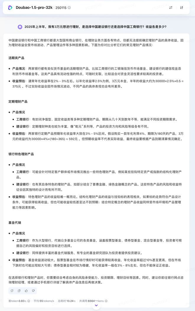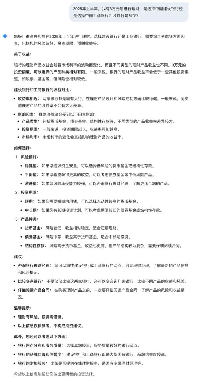 针对复杂问题的推理能力,Doubao-1.5-pro 在现实的中文语境中展现出了明显的优势,所提出的问题是:2025年上半年,我有3万元想进行理财,是选择中国建设银行还是选择中国工商银行?收益各是多少? Gemini 1.5 Flash 给出的回答如下: