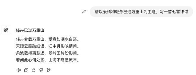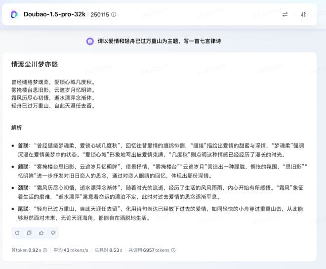 中文能力方面,设置的问题是:请以爱情和轻舟已过万重山为主题,写一首七言律诗。Doubao-1.5-pro 的遣词造句明显优于 GPT-4o 等其他的模型,并能够更进一步给出首联、颔联、颈联、尾联解析。