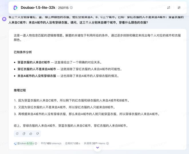 先来感受一下极致的推理和响应速度,提问一个中等难度的推理问题:有三个人分别穿着红、蓝、绿三种颜色的衣服,他们分别来自 A、B、C 三个城市。已知:穿红衣服的人不是来自 A 城市;穿蓝衣服的人来自 C 城市;来自 A 城市的人没有穿绿衣服。请问,这三个人分别来自哪个城市,穿着什么颜色的衣服?