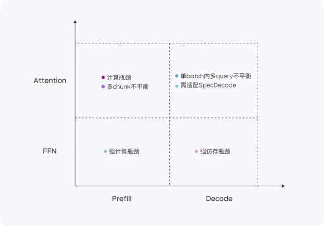 基于 MoE 模型,豆包搭建了高性能推理系统,在 Prefill/Decode 与 Attention/FFN 构成的四个计算象限中,表现出显著不同的计算与访存特征。针对四个不同象限,采用异构硬件结合不同的低精度优化策略,在确保低延迟的同时大幅提升吞吐量,在降低总成本的同时兼顾 TTFT 和 TPOT 的最优化目标。