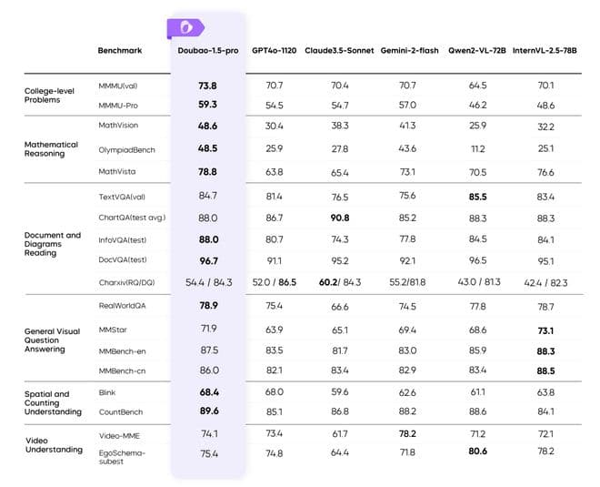 “效果领先,豆包大模型1.5超越GPT-4o、Claude3.5。”