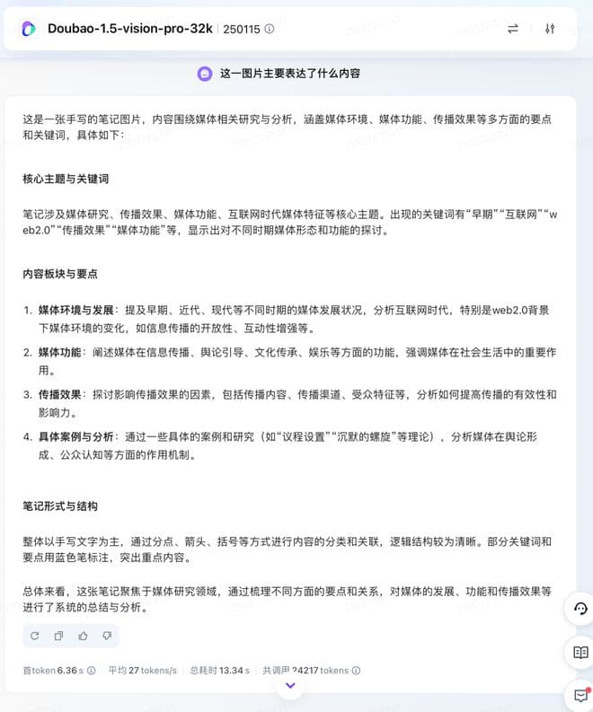 不得不说,这个图片如果不仔细看的话,人眼都不一定能看清,而豆包则能提取道其中 95% 的关键词和主题,且识别出了部分关键词用蓝色笔标注来突出重点内容,并进一步总结该笔记聚焦于媒体研究领域。