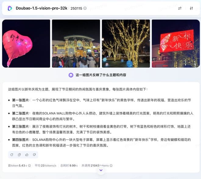 上传四张同一时期拍摄的照片,模型能在处理多张图片时获取关键要点,并总结出是“新年庆祝”的主题。