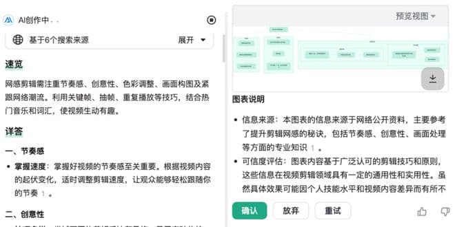比如,我们搜索“如何制作网感剪辑视频?”自由画布能够做到借助网络信息来源,生成一个逻辑清晰、细节详实的文档,从音效、创意性、节奏感等角度给出系统的操作指南,甚至会给我们附上表格和思维导图,帮助我们更好地理解。
