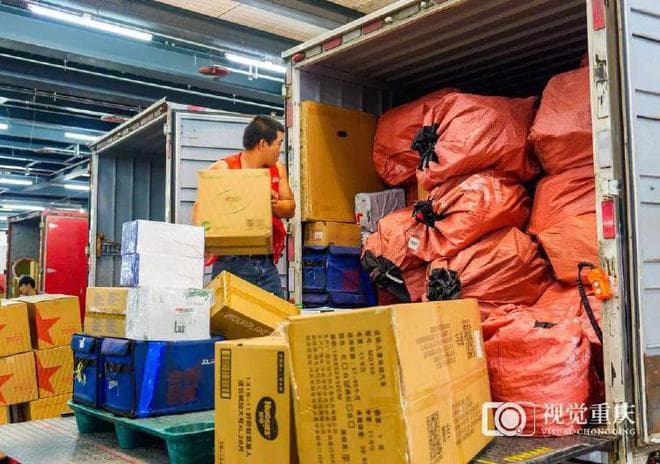 仓储分拣线上,工作人员将快递装车。记者 李雨恒 摄/视觉重庆