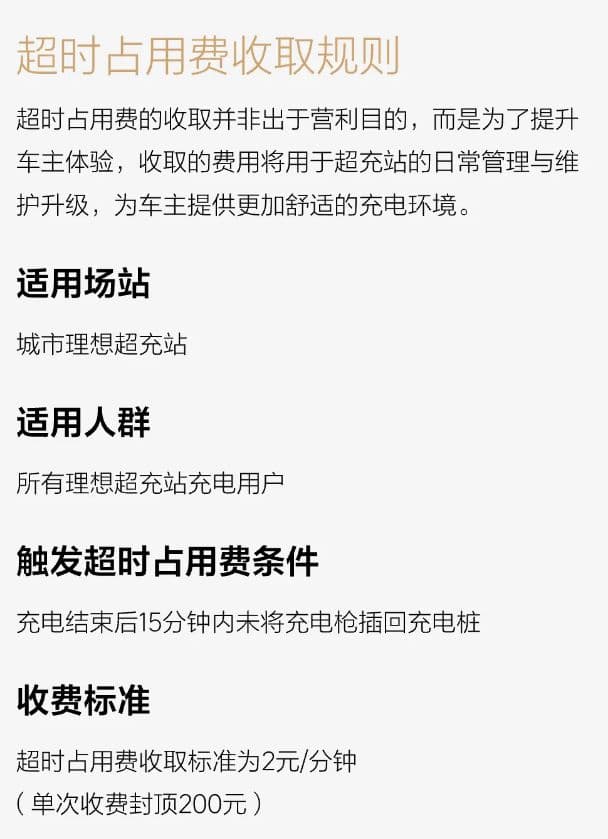 理想汽 车表示,为避免用户被收 取超时占用费,理想将在即将完成充电时 、完成充电时、充电结束后10分钟、充电结束后15分钟,这四个时间点通过理想汽车App、理想汽车微信小程序、短信或电话提醒用户及时驶离车位。
