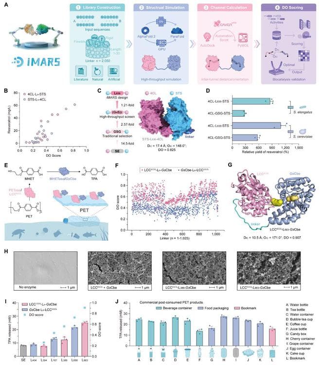 为了应对上述挑战,研究团队通过高通量测试及空间结构预测解析了人工多酶复合体的空间构效关系,初步破译了多酶空间邻近性和效率的“密码”,发现融合酶的空间距离和通道角度是影响催化效率的关键因素。基于此,研究团队开发了人工多酶复合体理性设计工具iMARS,内置包含上千种不同性质linker的数据库,通过ParaFold进行高通量蛋白质结构预测,并基于分子对接和CAVER等工具进行计算和DO Score打分筛选,实现从氨基酸序列到人工多酶复合体相对活性的快速预测。