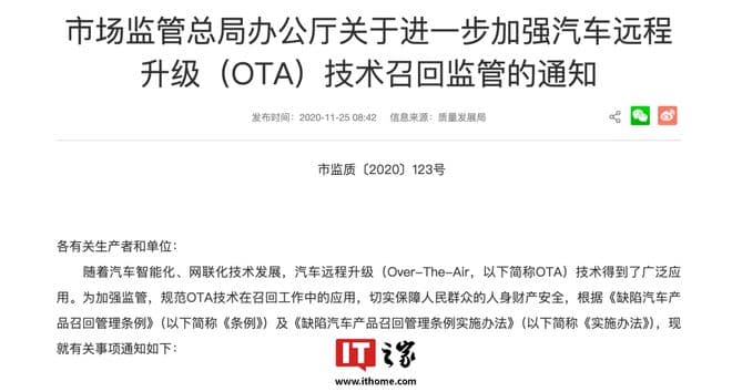 早在 2020 年 11 月,《市场监管总局办公厅关于进一步加强汽车远程升级(OTA)技术召回监管的通知》就已经对此作出了规定。