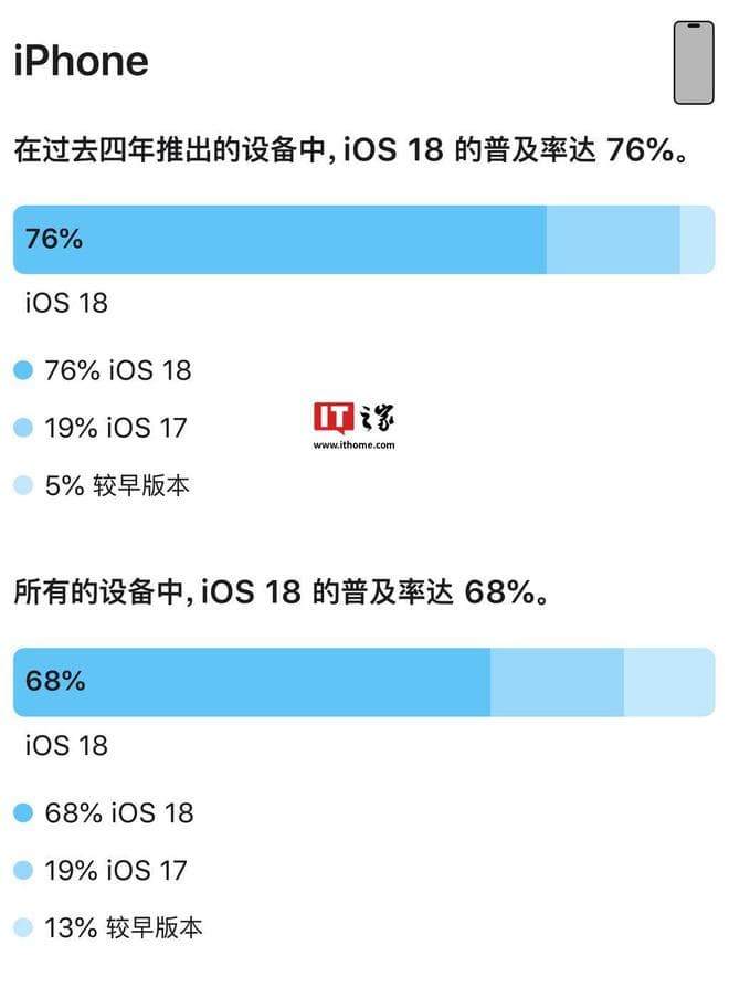 IT之家 1 月 25 日消息,苹果开发者支持网站更新数据,公布了 iOS 18 系统的普及率数据。数据显示,iOS 18 的普及速度与去年的 iOS 17 基本持平,在过去四年推出的设备中,iOS 18 的普及率达 76%;在所有的设备中,iOS 18 的普及率达 68%。