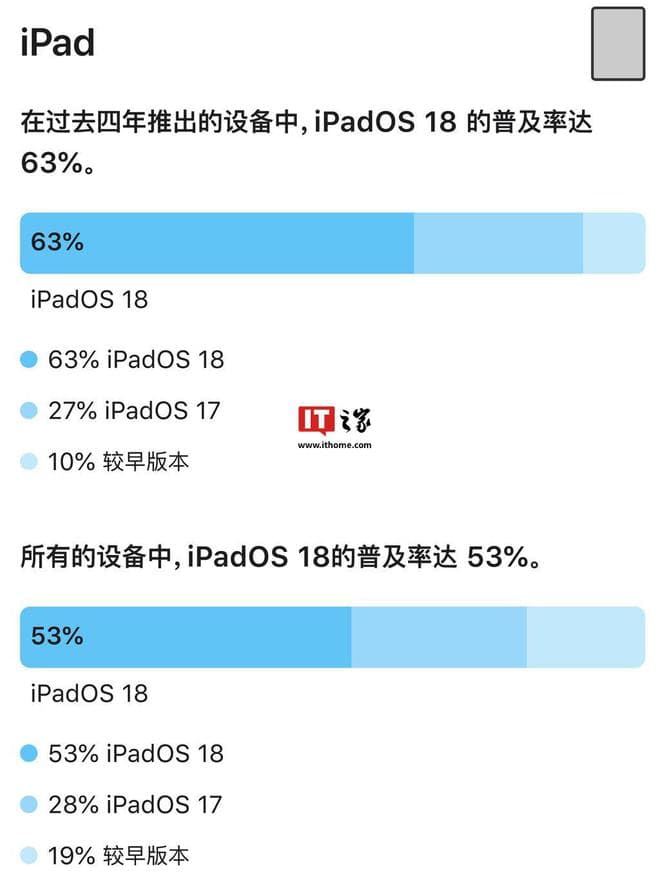 苹果公司还表示在过去四年推出的设备中,iPadOS 18 的普及率达 63%;在所有的设备中,iPadOS 18 的普及率达 53%。