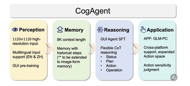 早在2023年12月,智谱便发布了CogAgent,是其第一个基于视觉语言模型(Visual Language Model, VLM)的开源 图形界面智能体 GUI Agent 模型。GLM-PC即是基于该模型的初代产品。据开发文档中介绍,通过多模态感知实现全 GUI 空间交互。这些 GUI Agent,类似人类,能以视觉形式感知界面元素与布局,模拟人类进行点击、键盘输入等元操作,极大拓展了 Agent 在虚拟交互空间的应用边界。