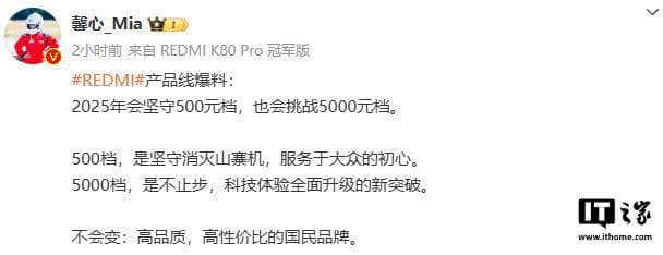 IT之家 1 月 25 日消息,小米 REDMI 产品经理胡馨心今日发文称,2025 年会坚守 500 元档,也会挑战 5000 元档。