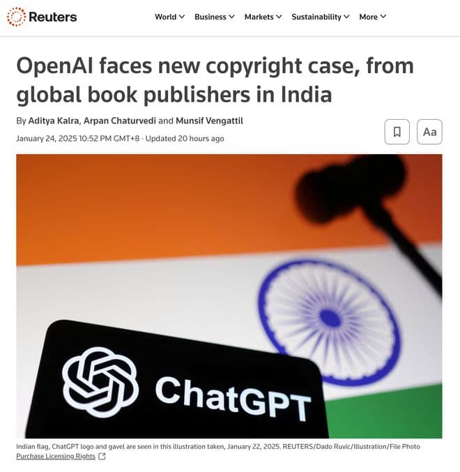 OpenAI又将面临版权诉讼:印度出版商称其擅自用保护内容训练模型