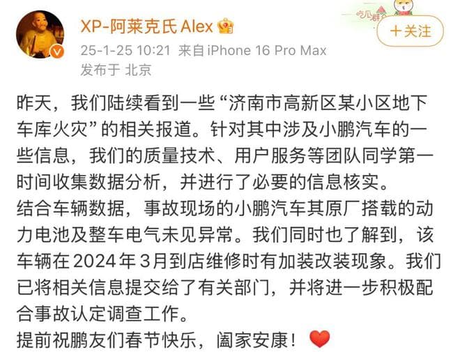 1月25日,小鹏汽车公关负责人@XP-阿莱克氏Alex 在微博发文回应“小鹏汽车起火烧毁地库十几辆车”一事。