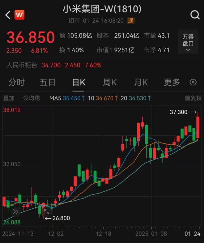 1月24日,小米集团(HK1810)股价盘中一度大涨超8%,截至收盘,小米集团报36.85港元,涨幅6.81%,收盘价为历史新高,其市值一天增加590亿港元。最新市值9251亿港元。