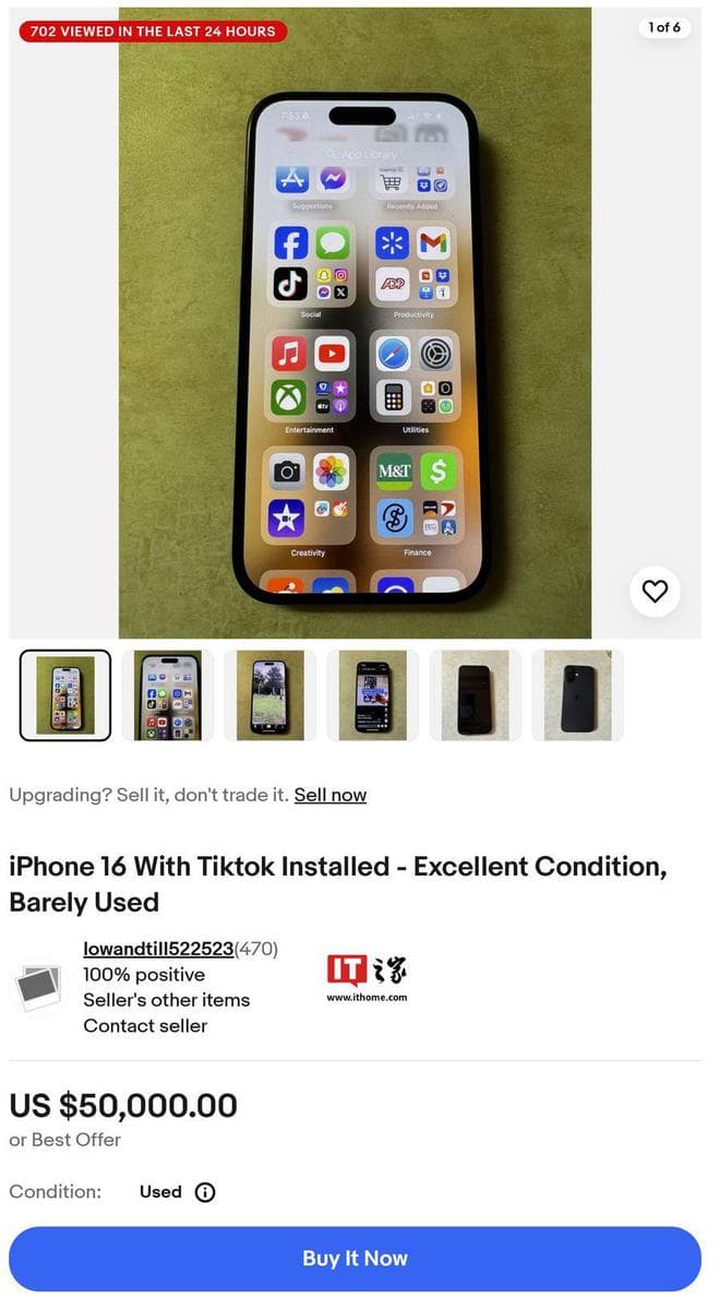IT之家 1 月 27 日消息,《财富》杂志今天(1 月 27 日)发布博文,报道称部分美国用户利用 TikTok 禁令空档期,在 Facebook 和 eBay 等平台上高价出售预装 TikTok 的二手手机,标价最高超 5 万美元(IT之家备注:当前约 36.3 万元人民币)。