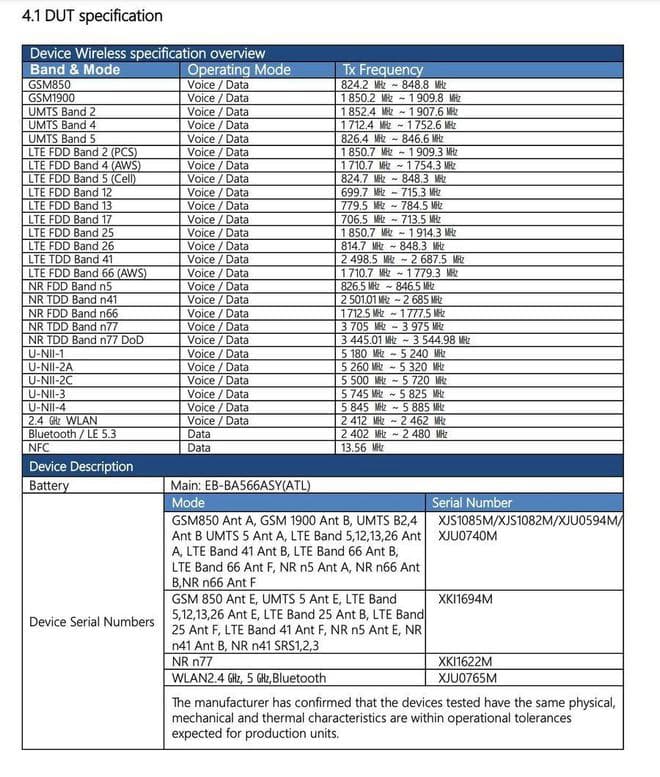 根据 FCC 认证文件显示,三星 Galaxy A56 5G 手机型号为 SM-A566E / DS,支持 GSM、WCDMA、LTE FDD 和 5G 网络。其 5G 频段覆盖 n1、3、5、7、8、20、28、38、40、41、66、77 和 78。此外,该机还支持蓝牙、GNSS、NFC 和 Wi-Fi(802.11.b/ g / n / a / ac / ax)。
