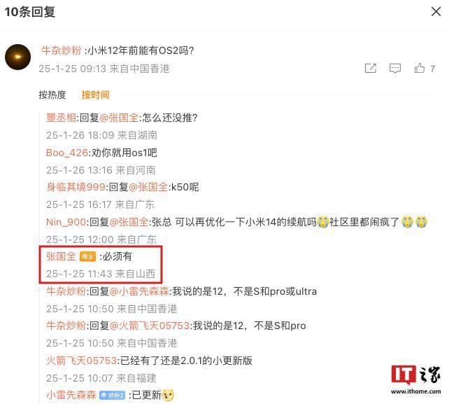 IT之家 1 月 27 日消息,小米手机系统软件部总监张国全上周(1 月 25 日)发微博分享了自己开车回老家过年的经历,评论区中有网友询问小米 12 系列手机是否能在年前获澎湃 HyperOS 2 大版本更新,他回复称“必须有”。