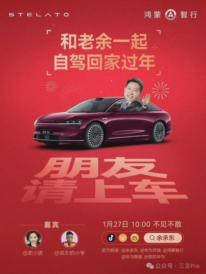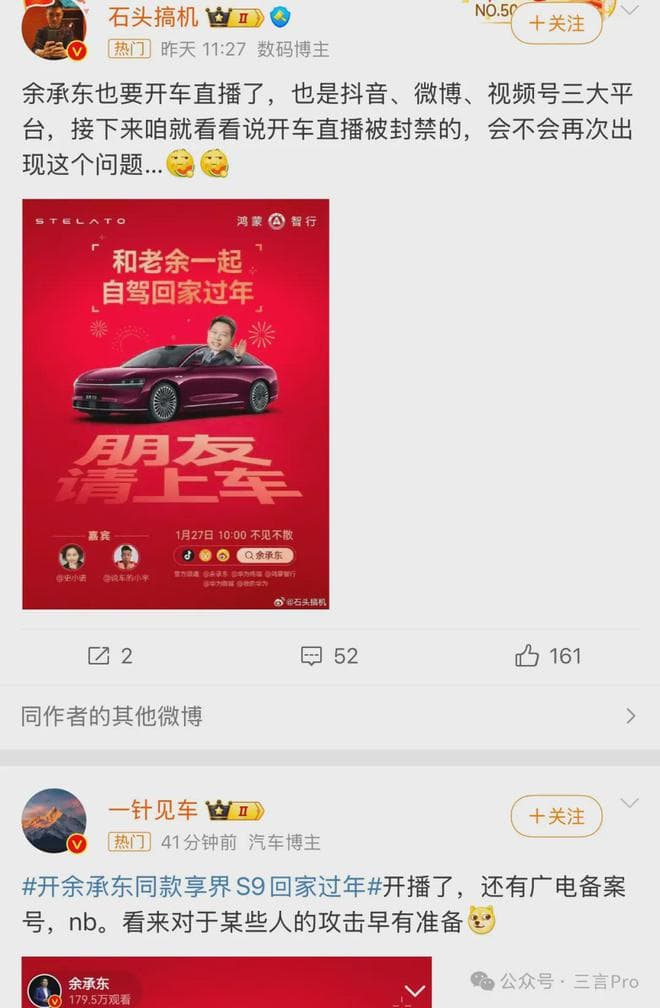 昨天,余承东预告了自己“自驾回安徽老家过年”的直播活动,直播平台包括微博、抖音等。