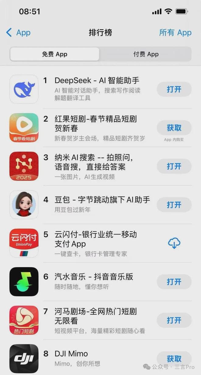 今日,DeepSeek更是登顶苹果中国地区和美国地区应用商店免费App下载排行榜,并在美区下载榜上超越了ChatGPT。