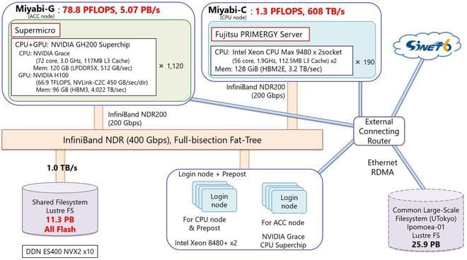 Miyabi 超算包含 Miyabi-G 加速节点系统和 Miyabi-C CPU节点系统,整体采用英伟达 InfiniBand NDR 互联,配备 11.3PB 容量的全闪存文件系统。