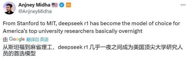 毕竟,正如 a16z 合伙人、Mistral 董事会成员 Anjney Midha 说的那样:从斯坦福到麻省理工,DeepSeek-R1 几乎一夜之间就成了美国顶尖大学研究人员的首选模型。