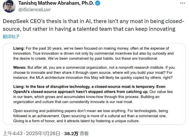 DeepSeek 创始人梁文锋之前接受的采访被翻译成了英文版,正在 AI 社区引发热议