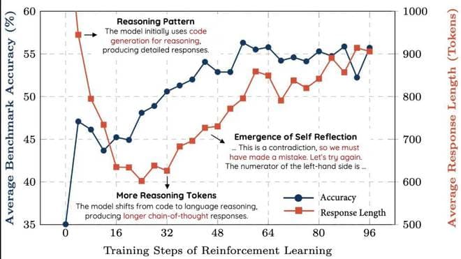 基础模型的质量很重要。0.5B 的小模型在猜测一个解答之后就会停止,而从 1.5B 规模开始,模型会开始学习搜索、自我验证、修正解答,从而可以得到远远更高的分数。