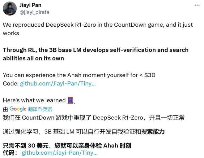 TinyZero 则是一个尝试复现 DeepSeek-R1-Zero 的项目,据其作者、伯克利 AI 研究所在读博士潘家怡(Jiayi Pan)介绍,该项目是基于 CountDown 游戏实现的,完整配方有一句话就能说完:「遵照 DeepSeek R1-Zero 的算法 —— 一个基础语言模型、提示词和 ground-truth 奖励,然后运行强化学习。」