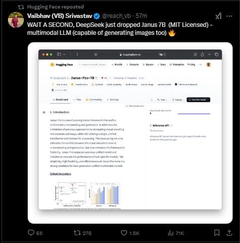 美东时间1月27日周一,AI社区Hugging Face显示,DeepSeek发布了分别名为Janus-Pro和JanusFlow的一系列开源多模态AI模型,参数大小从10亿到70亿不等,都已可在Hugging Face下载。