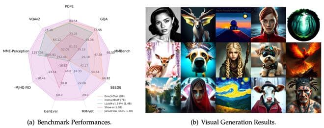 下图可见JanusFlow的基准测试表现与LLaVA等其他模型对比,以及它的生图结果展示。
